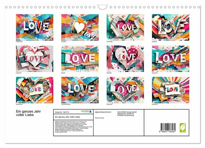 QUALITÄT - Hochwertiger Fotokalender mit 12 wunderschönen Motiven auf lichtbeständigem Bilderdruckpapier, robuste Spiralbindung mit Aufhängebügel.NACHHALTIG - deutliche Abfallreduzierung durch bedarfsgerechte Einzelstückfertigung, umweltfreundliches FSC-zertifiziertes Papier, Produktion in Deutschland, klimabewusste Logistik.PERFEKTES GESCHENK - Kalender für Freunde und Familie, für Kinder und Erwachsene, jung und alt, zu Weihnachten, Geburtstag oder zwischendurch.VIELFALT - Bildkalender in verschiedenen Formaten, z.B. DIN A5, DIN A4, DIN A3 sowie DIN A2. Ob Naturmotiv, Gemälde oder Fotos, ideal für ein persönliches Wohlfühlambiente.Farbenfrohe Papierdesigns mit dem Wort LOVE von Autor(in): Marlise Gaudig