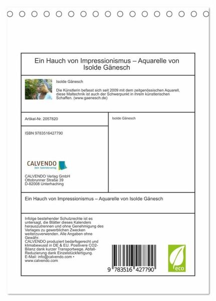 QUALITÄT - Hochwertiger Fotokalender mit 12 wunderschönen Motiven auf lichtbeständigem Bilderdruckpapier, robuste Spiralbindung.NACHHALTIG - deutliche Abfallreduzierung durch bedarfsgerechte Einzelstückfertigung, umweltfreundliches FSC-zertifiziertes Papier, Produktion in Deutschland, klimabewusste Logistik.PERFEKTES GESCHENK - Kalender für Freunde und Familie, für Kinder und Erwachsene, jung und alt, zu Weihnachten, Geburtstag oder zwischendurch.VIELFALT - Bildkalender in verschiedenen Formaten, z.B. DIN A5, DIN A4, DIN A3 sowie DIN A2. Ob Naturmotiv,Gemälde oder Fotos, ideal für ein persönliches Wohlfühlambiente.Die Zusammenfassung verschiedener Aquarellmotive, die einen Hauch an den früheren Impressionismus erinnern, verleihen in der Farbgebung ein unvergessliches Erlebnis. von Autor(in): Isolde Gänesch