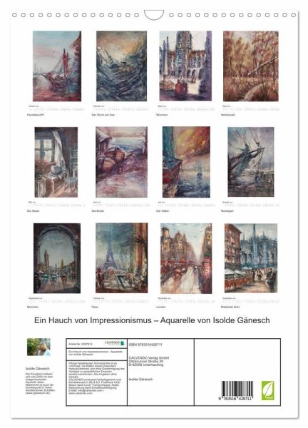 QUALITÄT - Hochwertiger Fotokalender mit 12 wunderschönen Motiven auf lichtbeständigem Bilderdruckpapier, robuste Spiralbindung mit Aufhängebügel.NACHHALTIG - deutliche Abfallreduzierung durch bedarfsgerechte Einzelstückfertigung, umweltfreundliches FSC-zertifiziertes Papier, Produktion in Deutschland, klimabewusste Logistik.PERFEKTES GESCHENK - Kalender für Freunde und Familie, für Kinder und Erwachsene, jung und alt, zu Weihnachten, Geburtstag oder zwischendurch.VIELFALT - Bildkalender in verschiedenen Formaten, z.B. DIN A5, DIN A4, DIN A3 sowie DIN A2. Ob Naturmotiv, Gemälde oder Fotos, ideal für ein persönliches Wohlfühlambiente.Die Zusammenfassung verschiedener Aquarellmotive, die einen Hauch an den früheren Impressionismus erinnern, verleihen in der Farbgebung ein unvergessliches Erlebnis. von Autor(in): Isolde Gänesch