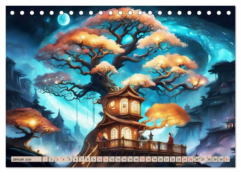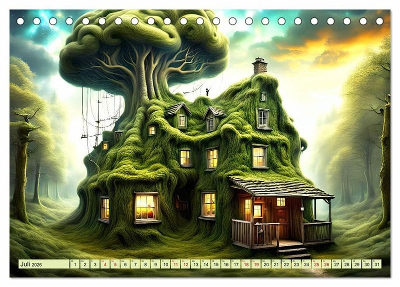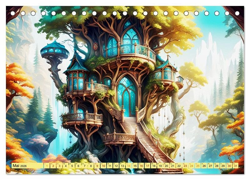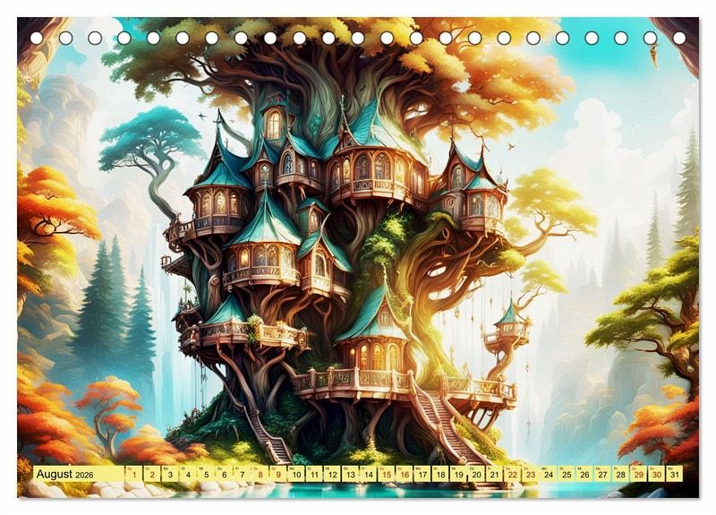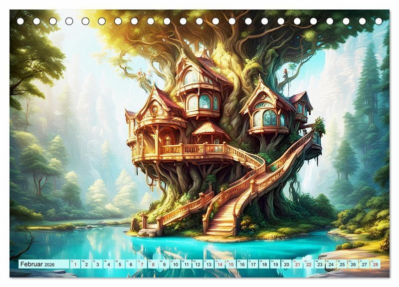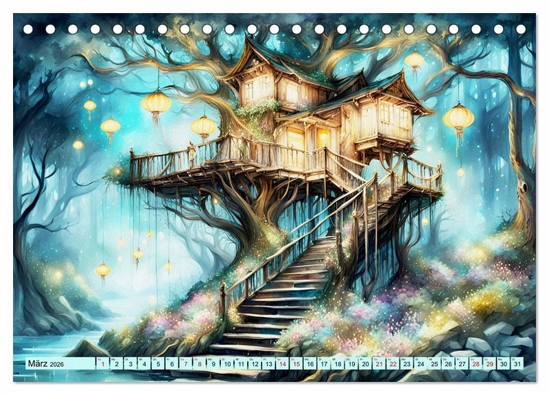 Jeder Monat offenbart eine Baumhausvision aus einer Welt, wo das Wunderbare greifbar scheint und die Natur in perfekter Harmonie mit menschlicher Schöpfungskunst steht. Stellen Sie sich vor, jeden Tag in das gezeichnete Blattwerk voll zauberhafter Details zu blicken und von schwebenden Hütten zu träumen, in denen jeder Gedanke zu einer Reise wird.