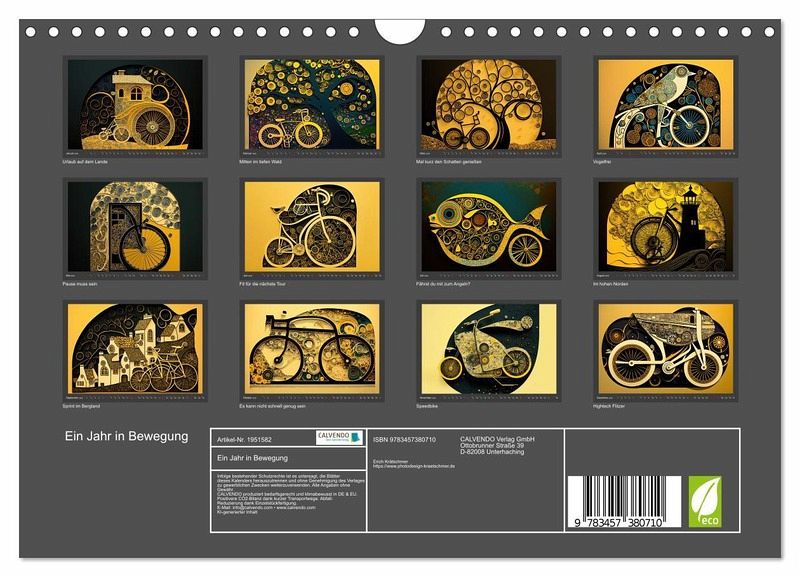 Ein Jahr in Bewegung mit dem Fahrrad ist eine inspirierende Reise durch die Jahreszeiten, die den Betrachter dazu ermutigt, aktiv zu sein und das Leben auf zwei Rädern zu genießen. Die abstrakten Illustrationen wurden mit künstlicher Intelligenz konzipiert und mit Photoshop modifiziert und optimiert.