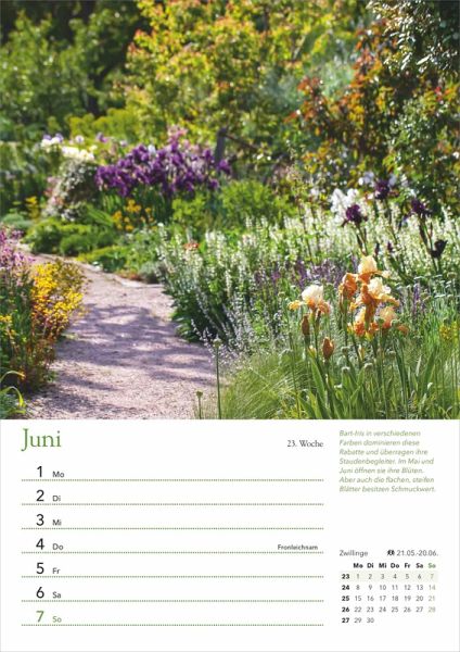 - 53 Pflanzenporträts und viele nützliche Gartentipps- Woche für Woche wissen, was im Garten zu tun ist- Wandkalender mit stabiler Spiralbindung- Format 21,0 x 29,7 cm- Praktisches Kalendarium mit viel Platz für persönliche Notizen- Mit Feiertagen, Mondphasen, Kalenderwochen, Sternzeichen, Ferientabelle
