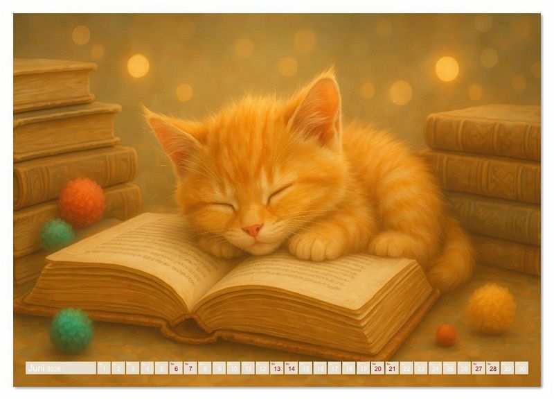 Juni: Schlafendes Kätzchen - Ein Kätzchen ruht auf einem aufgeschlagenen Buch