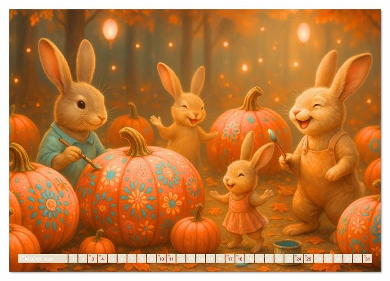 Oktober: Hasen und Kürbisse - Kleine Hasen bemalen Kürbisse im Wald