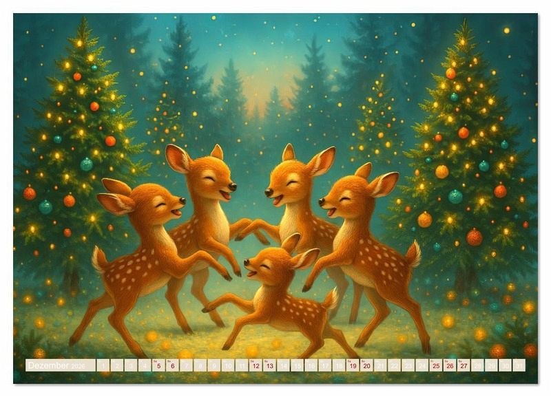 Dezember: Rehkitze im Lichterwald - Fünf Rehkitze tanzen um funkelnde Weihnachtsbäume