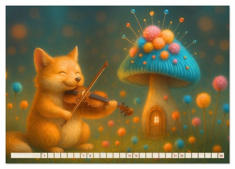 Februar: Der Geigenfuchs - Ein Fuchs spielt inmitten von Pilzen und Blumen