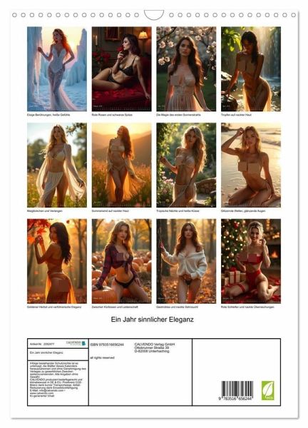 Erlebe ein Jahr voller Verführung, Eleganz und Leidenschaft - von der sanften Magie des Frühlings bis zur prickelnden Kälte des Winters. Lass dich von "Ein Jahr sinnlicher Eleganz" auf eine Reise durch atemberaubende Momente mitreißen: Zarte Blüten erwachen in der Frühlingssonne, heiße Sommerwinde umspielen nackte Haut, goldene Herbstblätter tanzen um sinnliche Kurven, und frostige Nächte glitzern voller Sehnsucht. Jeder Monat enthüllt ein neues Kapitel der Verlockung, eingefangen in faszinierenden Posen und luxuriösen Kulissen. Tauche ein in die Kunst der Sinnlichkeit - für ein Jahr, das die Schönheit und die Magie jeder Jahreszeit feiert.