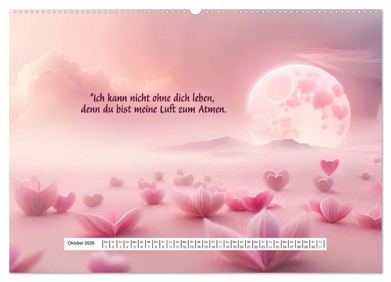 Unser Kalender 'Ein Jahr voller Liebe' bietet Ihnen 12 einzigartige Liebesmomente für jeden Monat des Jahres. Jedes Bild und jeder Liebesspruch wurde mit moderner künstlichen Intelligenz generiert, um Ihnen eine einzigartige Erfahrung zu bieten. Die Bilder sind von hoher Qualität und zeigen Ihnen atemberaubende romantische Szenen, die die Schönheit der Liebe aufzeigen. Die dazugehörigen Liebessprüche sind inspirierend und originell und wurden speziell für diesen Kalender generiert. Jeder Monat eigene bietet Ihnen eine Fülle von Emotionen und romantischen Momenten. Entdecken Sie ein neues Liebesabenteuer mit unserem 'Ein Jahr voller Liebe'-Kalender - ein perfektes Geschenk für jeden, der die Liebe und die Magie des Jahres schätzt!