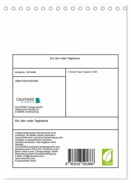 QUALITÄT - Hochwertiger Fotokalender mit 12 wunderschönen Motiven auf lichtbeständigem Bilderdruckpapier, robuste Spiralbindung.NACHHALTIG - deutliche Abfallreduzierung durch bedarfsgerechte Einzelstückfertigung, umweltfreundliches FSC-zertifiziertes Papier, Produktion in Deutschland, klimabewusste Logistik.PERFEKTES GESCHENK - Kalender für Freunde und Familie, für Kinder und Erwachsene, jung und alt, zu Weihnachten, Geburtstag oder zwischendurch.VIELFALT - Bildkalender in verschiedenen Formaten, z.B. DIN A5, DIN A4, DIN A3 sowie DIN A2. Ob Naturmotiv, Gemälde oder Fotos, ideal für ein persönliches Wohlfühlambiente.Fantasie und Natur träumerisch vereint! von Autor(in): trappart