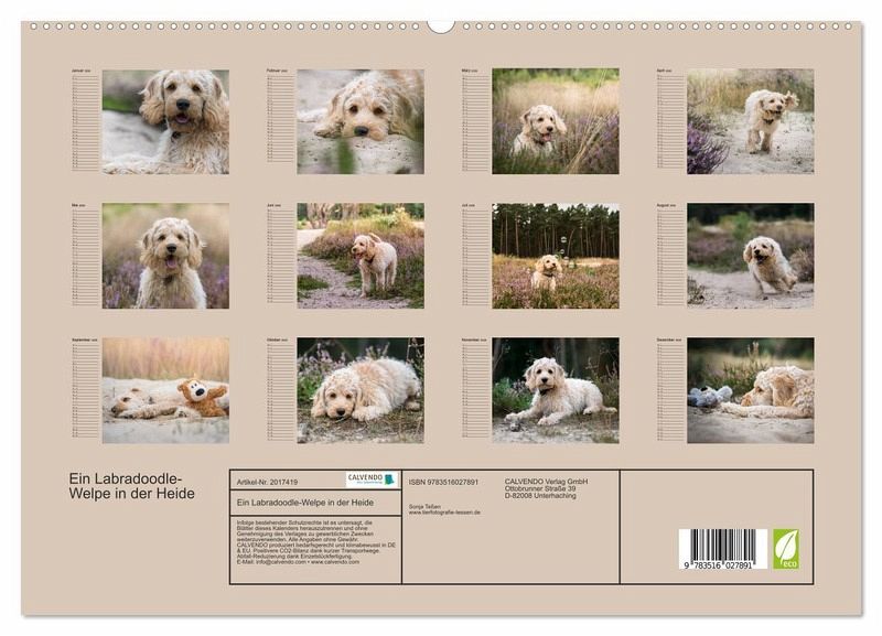 PREMIUM-LINIE - Brillanter Fotokalender mit 12 wunderschönen Motiven, Kunstdruck in Hochglanz in Museumsqualität.QUALITÄT - edle Materialien, stabile Rückwand mit 2 innovativen Einstecktaschen für eine optimale Präsentation an der Wand.NACHHALTIG - deutliche Abfallreduzierung durch bedarfsgerechte Einzelstückfertigung, umweltfreundliches FSC-zertifiziertes Papier, Produktion in Deutschland, klimabewusste Logistik.PERFEKTES GESCHENK - Kalender für Freunde und Familie, für Kinder und Erwachsene, jung und alt, zu Weihnachten, Geburtstag oder zwischendurch.Welpenbilder eines süßen Labradoodles beim Spiel und Spaß in der Heide von Autor(in): Sonja Teßen