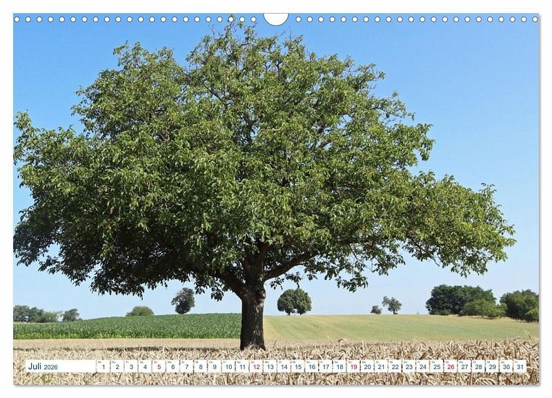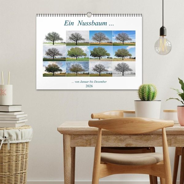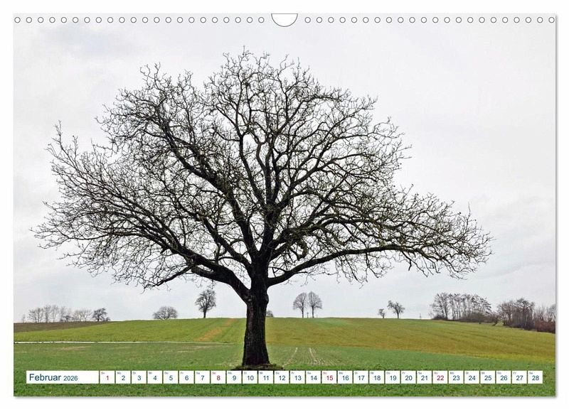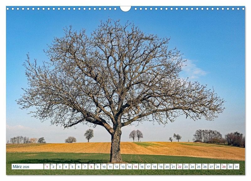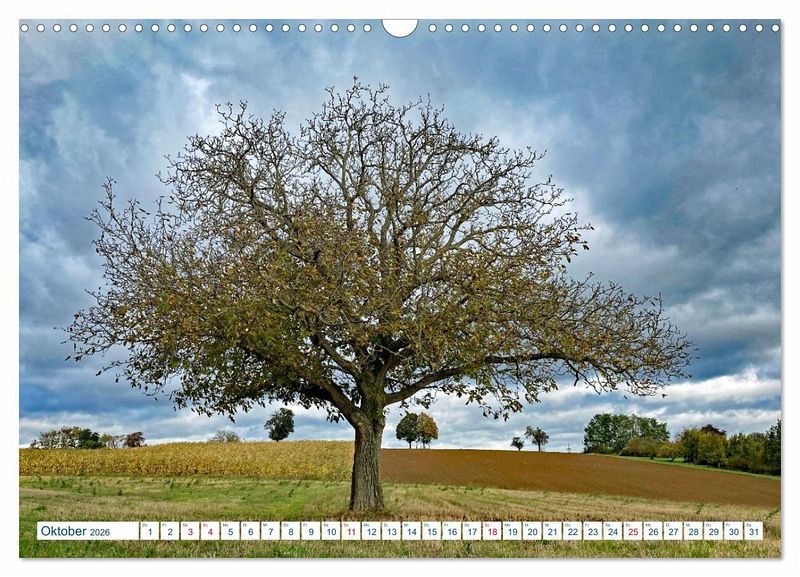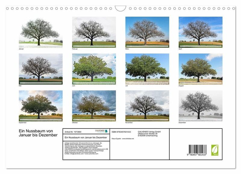Der Kalender zeigt, wie sich ein freistehender Nussbaum und die Landschaft um ihn herum im Laufe des Jahres verändert.