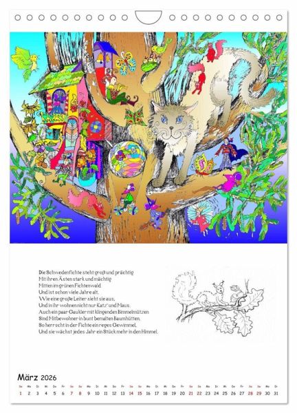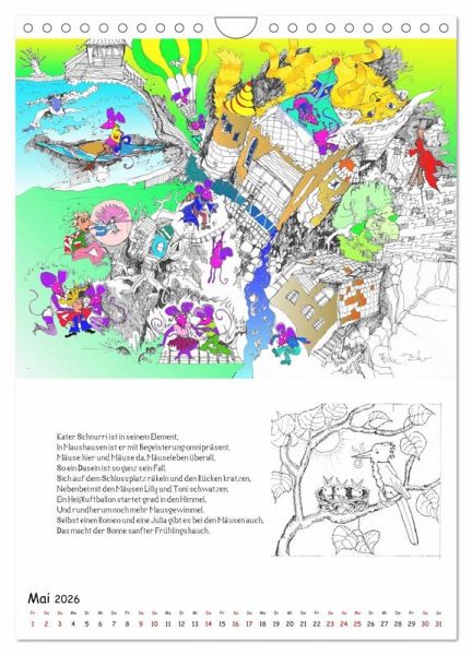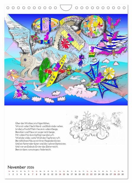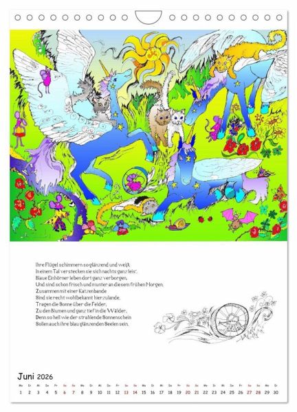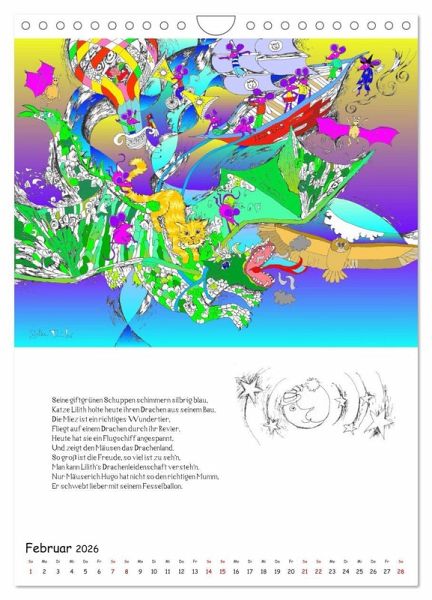 Was so ein Katzen- oder KaterSeelchen denn alles so träumen kann, von der großen weiten Welt, von geflügelten Einhörnern, Tiefseewelten, von Weihnachten, Ostern oder dem Zuckertütenbaum. Hier trifft man Ritter und Elfen, märchenhafte uralte Bäume und besucht die Mondmiez, für alle ist etwas dabei. Ein Katzenkalender, der nur so sprüht vor Phantasie. Phantastische Welten eröffnen Katzen und Katern ungeahnte Möglichkeiten. Fliegen, Segeln, Tauchen und dazu Drachen, geflügelte Einhörner, Elfen, Osterhasen und ein Elch, nicht zu vergessen die allgegenwärtigen Mäuse, in friedlicher Eintracht.