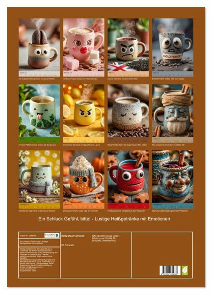 Zwölf Tassen, zwölf Gefühle - in diesem einzigartigen Kalender zeigen Kaffee, Tee, Kakao und Glühwein ihr wahres Gesicht. Ob müder Kaffee, frecher Minztee oder beschwipster Glühwein: Jede Tasse hat Charakter. Ein origineller Hingucker für Küche, Büro oder Homeoffice - ideal für alle, die Heißgetränke und Humor lieben. Perfekt als witziges Geschenk für Kollegen, Freunde, Familie oder als Mitbringsel für Kaffee- und Teeliebhaber. Charmant, skurril und emotional - Monat für Monat. Auch ohne Koffein ein echter Wachmacher an der Wand. Für gute Laune am Morgen oder einfach zum Schmunzeln zwischendurch. Wer Kaffee liebt, wird diesen Kalender feiern. Bilder mit KI generiert.