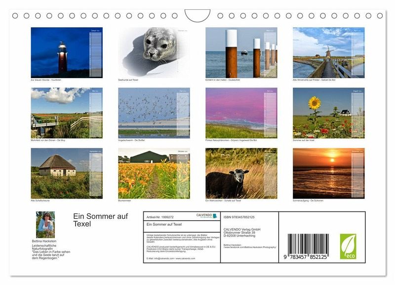QUALITÄT - Hochwertiger Fotokalender mit 12 wunderschönen Motiven auf lichtbeständigem Bilderdruckpapier, robuste Spiralbindung mit Aufhängebügel.NACHHALTIG - deutliche Abfallreduzierung durch bedarfsgerechte Einzelstückfertigung, umweltfreundliches FSC-zertifiziertes Papier, Produktion in Deutschland, klimabewusste Logistik.PERFEKTES GESCHENK - Kalender für Freunde und Familie, für Kinder und Erwachsene, jung und alt, zu Weihnachten, Geburtstag oder zwischendurch.VIELFALT - Bildkalender in verschiedenen Formaten, z.B. DIN A5, DIN A4, DIN A3 sowie DIN A2. Ob Naturmotiv, Gemälde oder Fotos, ideal für ein persönliches Wohlfühlambiente.Ein fotografischer Sommerspaziergang auf Texel von Autor(in): Bettina Hackstein