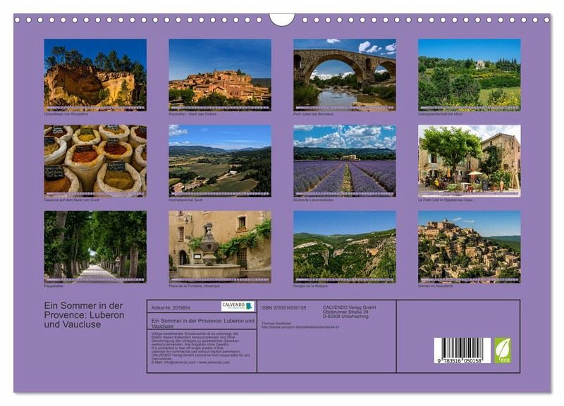 QUALITÄT - Hochwertiger Fotokalender mit 12 wunderschönen Motiven auf lichtbeständigem Bilderdruckpapier, robuste Spiralbindung mit Aufhängebügel.NACHHALTIG - deutliche Abfallreduzierung durch bedarfsgerechte Einzelstückfertigung, umweltfreundliches FSC-zertifiziertes Papier, Produktion in Deutschland, klimabewusste Logistik.PERFEKTES GESCHENK - Kalender für Freunde und Familie, für Kinder und Erwachsene, jung und alt, zu Weihnachten, Geburtstag oder zwischendurch.VIELFALT - Bildkalender in verschiedenen Formaten, z.B. DIN A5, DIN A4, DIN A3 sowie DIN A2. Ob Naturmotiv, Gemälde oder Fotos, ideal für ein persönliches Wohlfühlambiente.Sommerliche Impressionen aus der Provence von Autor(in): Thomas Seethaler