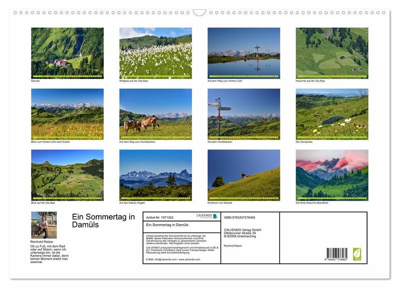 Die Bilder dieses Kalenders entstanden auf dem "Damülser Rundweg", einer leichten Bergwanderung in Damüls. Die Bilder dokumentieren der Verlauf der Wanderung von ca. 9:00 Uhr bis ca. 16:00 Uhr mit reichlich Brotzeit- und Fotopausen. Eine echte Genuss-Tour durch bunt blühende Almwiesen, bei der man ein herrliches Bergpanorama genießt - von den Allgäuer Bergen, über das Lechquellgebirge, die Silvrettagipfel bis weit in die Schweizer Alpen.