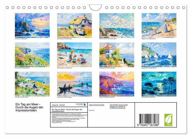 Tauchen Sie ein in die faszinierende Welt des Meeres, eingefangen im impressionistischen Malstil. Dieser kunstvoll KI-generierte Kalender "Ein Tag am Meer - Durch die Augen der Impressionisten" zeigt zwölf stimmungsvolle Szenen voller Licht, Farbe und Bewegung - von sanften Sonnenuntergängen über wilde Klippen bis hin zu idyllischen Strandszenen. Die lebendigen Pinselstriche und harmonischen Farbübergänge lassen die Schönheit der Küste lebendig werden. Perfekt für alle, die sich das ganze Jahr über eine künstlerische Meeresbrise nach Hause holen möchten!