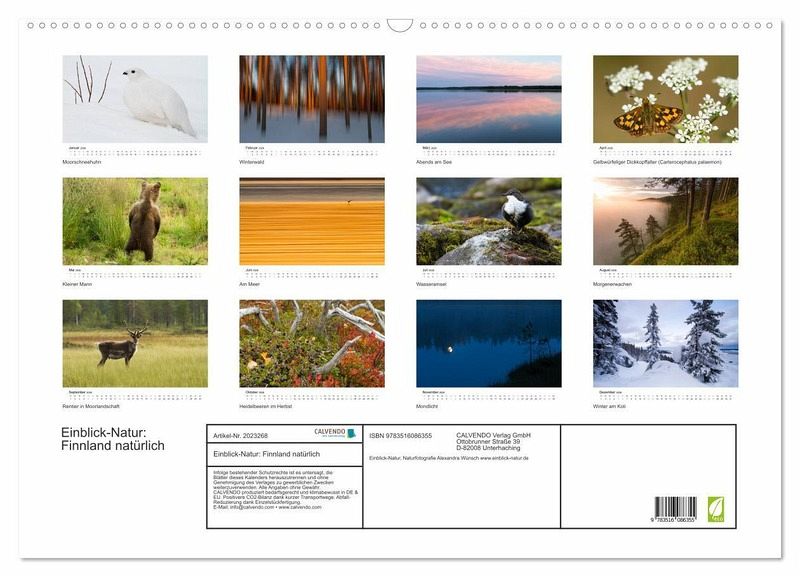 QUALITÄT - Hochwertiger Fotokalender mit 12 wunderschönen Motiven auf lichtbeständigem Bilderdruckpapier, robuste Spiralbindung mit Aufhängebügel.NACHHALTIG - deutliche Abfallreduzierung durch bedarfsgerechte Einzelstückfertigung, umweltfreundliches FSC-zertifiziertes Papier, Produktion in Deutschland, klimabewusste Logistik.PERFEKTES GESCHENK - Kalender für Freunde und Familie, für Kinder und Erwachsene, jung und alt, zu Weihnachten, Geburtstag oder zwischendurch.VIELFALT - Bildkalender in verschiedenen Formaten, z.B. DIN A5, DIN A4, DIN A3 sowie DIN A2. Ob Naturmotiv, Gemälde oder Fotos, ideal für ein persönlichesWohlfühlambiente.Natur- und Tierfotografien aus finnisch Lappland und Nordkarelien von Autor(in): Einblick-Natur