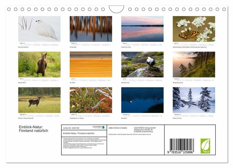 QUALITÄT - Hochwertiger Fotokalender mit 12 wunderschönen Motiven auf lichtbeständigem Bilderdruckpapier, robuste Spiralbindung mit Aufhängebügel.NACHHALTIG - deutliche Abfallreduzierung durch bedarfsgerechte Einzelstückfertigung, umweltfreundliches FSC-zertifiziertes Papier, Produktion in Deutschland, klimabewusste Logistik.PERFEKTES GESCHENK - Kalender für Freunde und Familie, für Kinder und Erwachsene, jung und alt, zu Weihnachten, Geburtstag oder zwischendurch.VIELFALT - Bildkalender in verschiedenen Formaten, z.B. DIN A5, DIN A4, DIN A3 sowie DIN A2. Ob Naturmotiv, Gemälde oder Fotos, ideal für ein persönlichesWohlfühlambiente.Natur- und Tierfotografien aus finnisch Lappland und Nordkarelien von Autor(in): Einblick-Natur