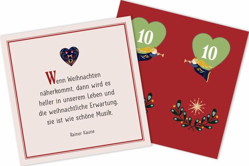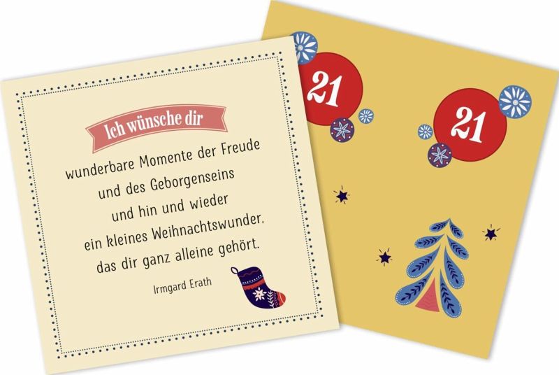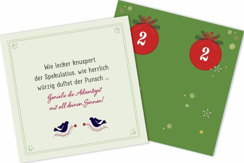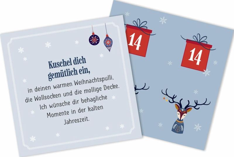 In dieser Adventskalender-Box finden sich 24 nummerierte und gefaltete Zettelchen, die jeden Tag mit einer persönlichen Botschaft oder einem lieben Wunsch überraschen. Die zauberhaft illustrierte Geschenkschachtel versprüht weihnachtliche Stimmung und eignet sich bestens als kleines Mitbringsel und Wichtelgeschenk. Die Zettel können auch einzeln als Füllung für einen selbst gebastelten Adventskalender verwendet werden.