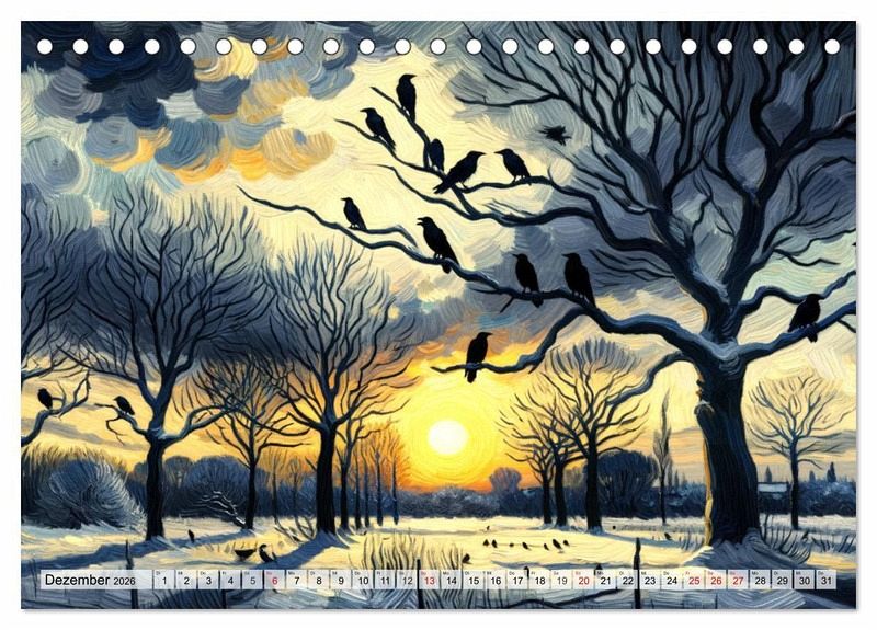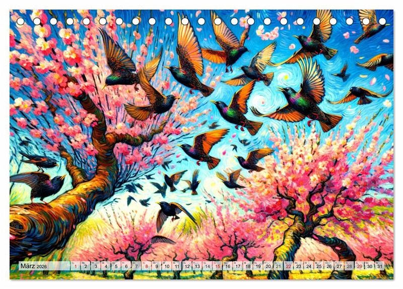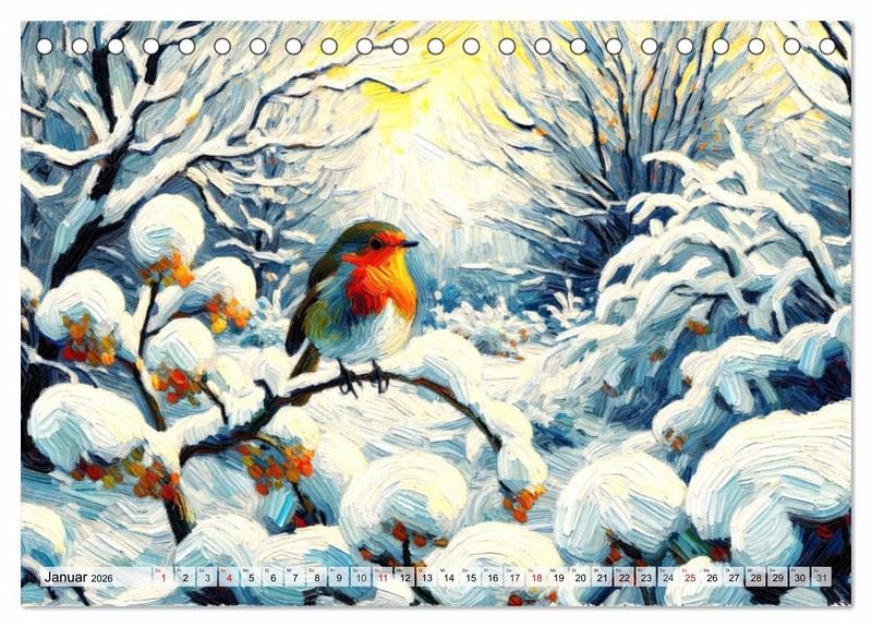 Tauchen Sie ein in eine Welt, in der sich die Lebendigkeit der Natur mit der Brillanz Vincent van Goghs vereint. Dieser einzigartige Kalender präsentiert Monat für Monat meisterhaft gestaltete Szenen, die Vögel und Blumen in van Goghs unverwechselbarem Stil einfangen. Jedes Bild ist ein Kunstwerk für sich, lebendig und ausdrucksstark, und bringt die Schönheit der Jahreszeiten zum Leuchten. Von der stillen Eleganz eines winterlichen Rotkehlchens bis zur prächtigen Farbenpracht eines Sommerlavendelfeldes - jeder Monat entführt Sie in eine andere Szene, die sorgfältig ausgewählt und liebevoll im Stil dieses großen Meisters der Kunst nachempfunden wurde. Ein täglicher Begleiter, der die Sinne erfreut und den Geist belebt, erstellt mit modernster KI Technologie.