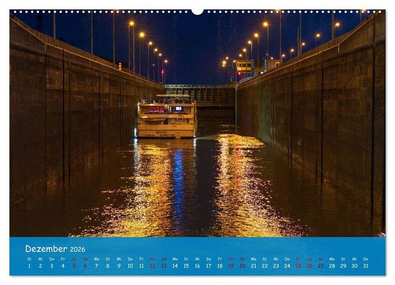 Dezember: Einfahrt in eine beleuchtete Schleuse am Abend