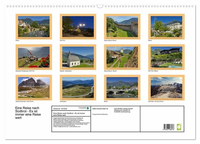 QUALITÄT - Hochwertiger Fotokalender mit 12 wunderschönen Motiven auf lichtbeständigem Bilderdruckpapier, robuste Spiralbindung mit Aufhängebügel.NACHHALTIG - deutliche Abfallreduzierung durch bedarfsgerechte Einzelstückfertigung, umweltfreundliches FSC-zertifiziertes Papier, Produktion in Deutschland, klimabewusste Logistik.PERFEKTES GESCHENK - Kalender für Freunde und Familie, für Kinder und Erwachsene, jung und alt, zu Weihnachten, Geburtstag oder zwischendurch.VIELFALT - Bildkalender in verschiedenen Formaten, z.B. DIN A5, DIN A4, DIN A3 sowie DIN A2. Ob Naturmotiv, Gemälde oder Fotos, ideal für ein persönliches Wohlfühlambiente.Südtirol ist das perfekte Urlaubsziel. von Autor(in): FOTO - BALZEREK