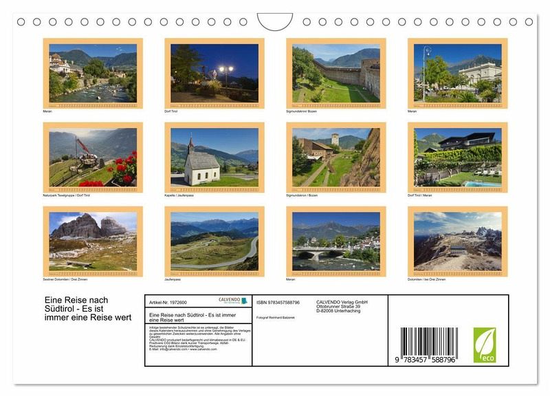 QUALITÄT - Hochwertiger Fotokalender mit 12 wunderschönen Motiven auf lichtbeständigem Bilderdruckpapier, robuste Spiralbindung mit Aufhängebügel.NACHHALTIG - deutliche Abfallreduzierung durch bedarfsgerechte Einzelstückfertigung, umweltfreundliches FSC-zertifiziertes Papier, Produktion in Deutschland, klimabewusste Logistik.PERFEKTES GESCHENK - Kalender für Freunde und Familie, für Kinder und Erwachsene, jung und alt, zu Weihnachten, Geburtstag oder zwischendurch.VIELFALT - Bildkalender in verschiedenen Formaten, z.B. DIN A5, DIN A4, DIN A3 sowie DIN A2. Ob Naturmotiv, Gemälde oder Fotos, ideal für ein persönliches Wohlfühlambiente.Südtirol ist das perfekte Urlaubsziel. von Autor(in): FOTO - BALZEREK