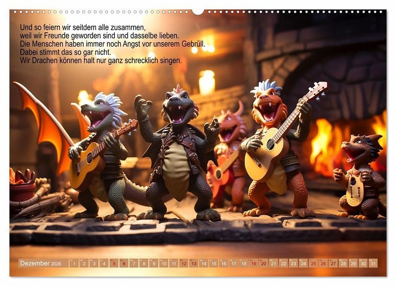 Viele Menschen denken ja, sie wüssten schon alles über Drachen. Es gibt so viele Bücher und Filme, also muss doch schon alles bekannt sein? Aber nein. Hier in diesem Kalender erlebst du die echte, wahre Geschichte, die keiner erzählt. Weil es den Menschen zu peinlich ist vermutlich. Aber sieh selbst und lass dich inspirieren, die Geschichte zu den Bildern weiter zu erzählen. Vielleicht fallen dir noch ganz andere Dinge ein, die die Drachen niemals erzählt haben?