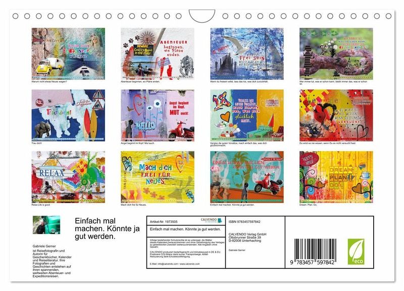 Die in fröhlichen und kräftigen Farben gestalteten Kalenderseiten mit den modernen und coolen Sprüchen motivieren jeden Tag aufs Neue. Die positiven Impulse in diesem dekorativen Gute-Laune-Kalender in äußerst fröhlichen Farben inspirieren durchs ganze Jahr. Wunderschöne Collagen, zusammengestellt aus Bildern aus aller Welt, erfreuen Sie selbst oder sind das perfekte und besondere Geschenk für Optimisten und solche, die es werden wollen. Gabriele Gerner hat die Fotografien auf vielen, teilweise mehrmonatigen Reisen in aller Welt gemacht. Weitere Werke sind z.B. ein eigener Bildband mit Geschichten bei National Geographic, etwa 40 365-Tage-Kalender mit eigenen Fotos bei mehreren Verlagen.