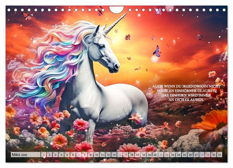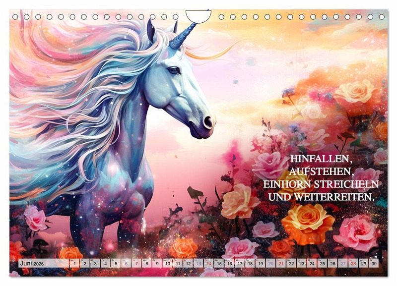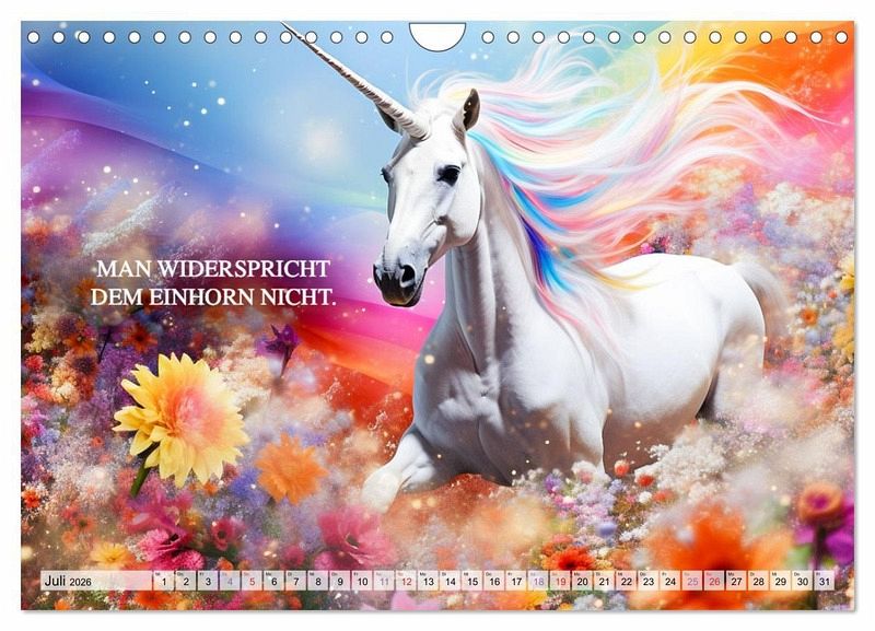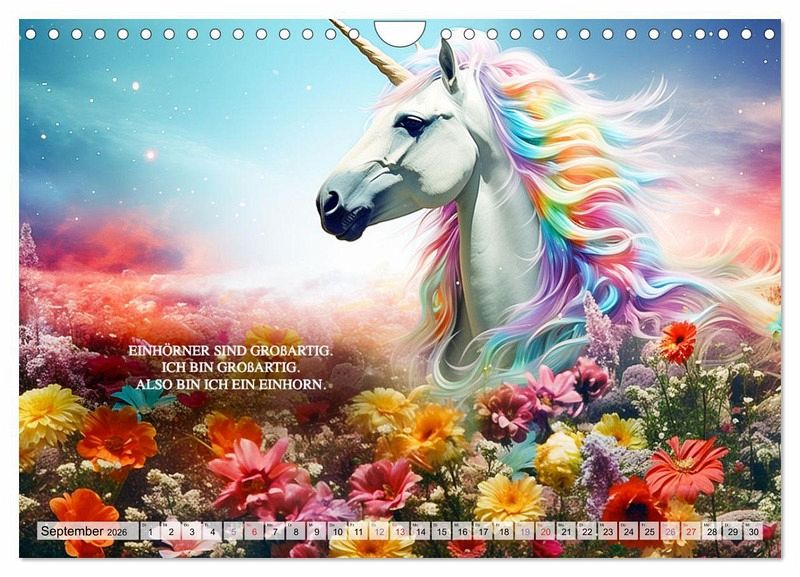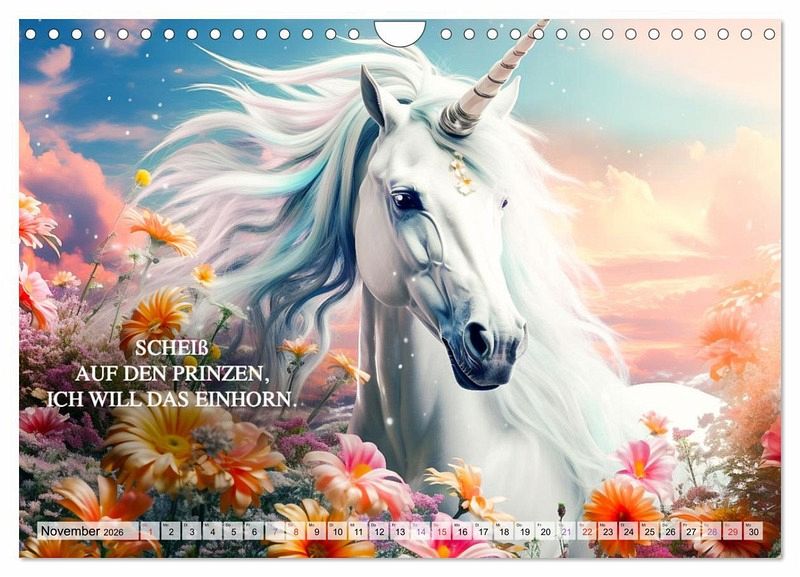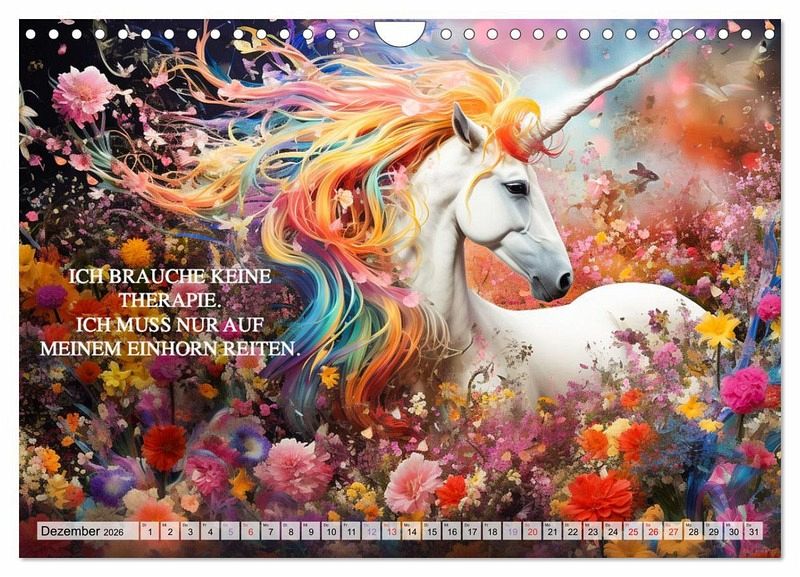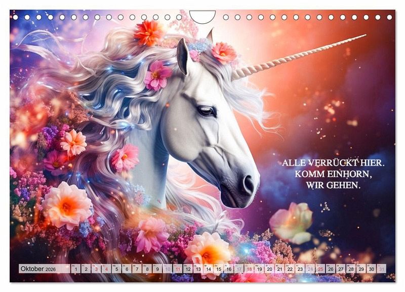 Verzaubere das neue Jahr mit unserem zauberhaften Wandkalender. Er ist die perfekte Kombination aus Einhörnern und coolen Sprüchen! Dieser bezaubernde Kalender bringt nicht nur Magie in deine Tage, sondern auch eine extra Portion Stil an deine Wand.Monat für Monat wirst du von unseren liebevoll gestalteten Einhornbildern verzaubert, die dir ein Lächeln ins Gesicht zaubern werden. Von funkelnden Sternennächten bis hin zu märchenhaften Landschaften, jeder Monat enthüllt eine neue, fesselnde Szene, die deine Fantasie beflügelt.Doch das ist noch nicht alles! Unsere coolen Sprüche begleiten dich durch das Jahr und geben dir täglich die Motivation, die du brauchst. Mal witzig, mal inspirierend, sie sind der perfekte Begleiter für dein aufregendes Jahr voller Möglichkeiten.Der Wandkalender eignet sich auch hervorragend als Geschenk für deine Lieben. Zeige ihnen, wie sehr du ihre Einzigartigkeit schätzt, indem du ihnen diesen bezaubernden Kalender schenkst. Er ist nicht nur ein praktisches Geschenk, sondern auch eine Erinnerung daran, dass Magie überall zu finden ist.Egal, ob du ihn für dich selbst kaufst oder als Mitbringsel für Freunde und Familie - unser Einhorn-Wandkalender mit coolen Sprüchen wird sicherlich ein Highlight in jedem Raum sein. Lass dich von der Magie verführen und sichere dir deinen Kalender noch heute! Erstellt wurden die Bilder mit KI und Photoshop.