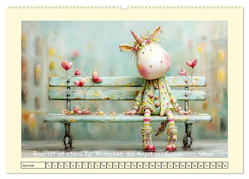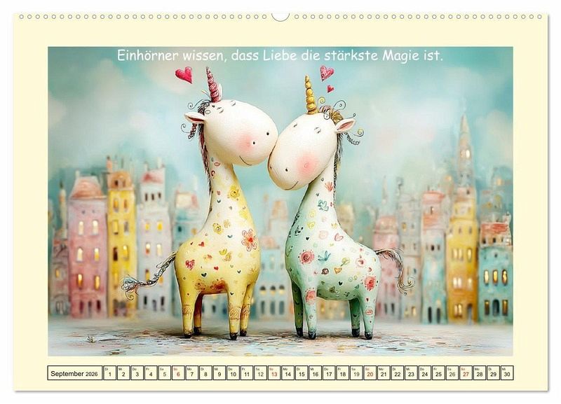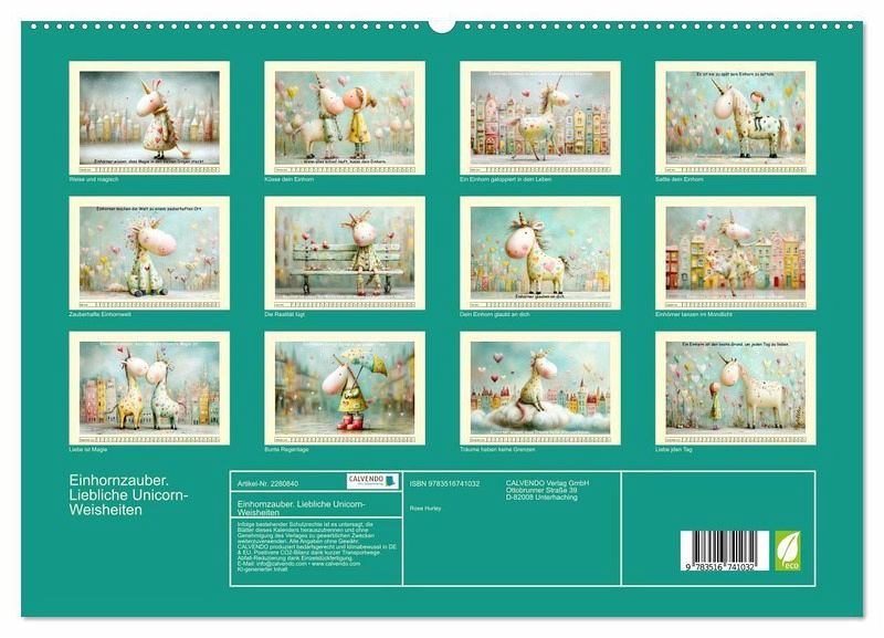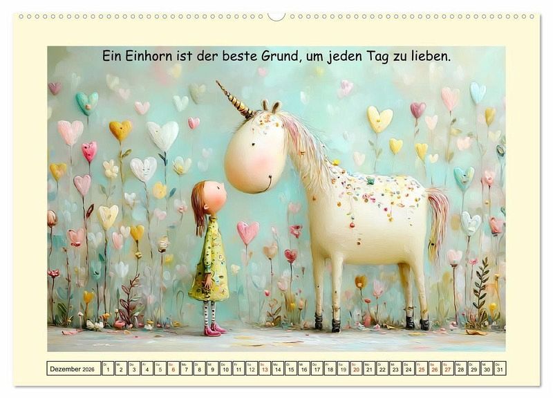 Dieser Kalender zeigt liebliche Einhörner, die Monat für Monat herzerwärmende Weisheiten zum besten geben. Jede Illustration wurde mit der Hilfe von KI erstellt und zeigt eine kleine Szene voller Leichtigkeit, Fantasie und märchenhaftem Glanz. Die warmen Farben und liebevollen Details machen den Kalender zu einem Begleiter für alle, die an die Magie der Unicorns glauben. So wird aus jedem Monat ein kleines, funkelndes Wunder.