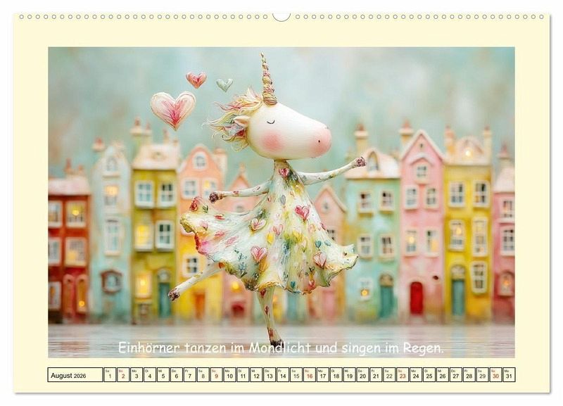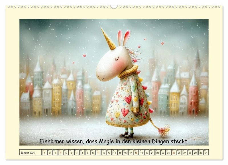 Dieser Kalender zeigt liebliche Einhörner, die Monat für Monat herzerwärmende Weisheiten zum besten geben. Jede Illustration wurde mit der Hilfe von KI erstellt und zeigt eine kleine Szene voller Leichtigkeit, Fantasie und märchenhaftem Glanz. Die warmen Farben und liebevollen Details machen den Kalender zu einem Begleiter für alle, die an die Magie der Unicorns glauben. So wird aus jedem Monat ein kleines, funkelndes Wunder.