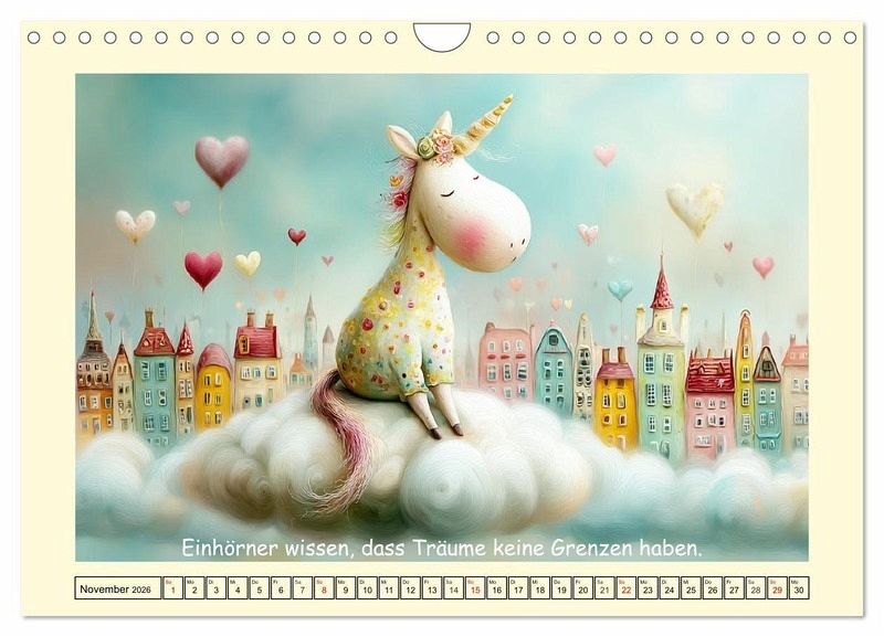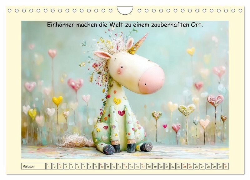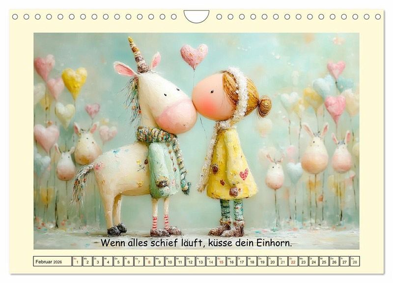 Dieser Kalender zeigt liebliche Einhörner, die Monat für Monat herzerwärmende Weisheiten zum besten geben. Jede Illustration wurde mit der Hilfe von KI erstellt und zeigt eine kleine Szene voller Leichtigkeit, Fantasie und märchenhaftem Glanz. Die warmen Farben und liebevollen Details machen den Kalender zu einem Begleiter für alle, die an die Magie der Unicorns glauben. So wird aus jedem Monat ein kleines, funkelndes Wunder.