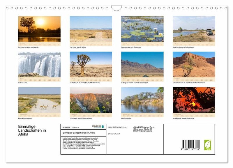 QUALITÄT - Hochwertiger Fotokalender mit 12 wunderschönen Motiven auf lichtbeständigem Bilderdruckpapier, robuste Spiralbindung mit Aufhängebügel.NACHHALTIG - deutliche Abfallreduzierung durch bedarfsgerechte Einzelstückfertigung, umweltfreundliches FSC-zertifiziertes Papier, Produktion in Deutschland, klimabewusste Logistik.PERFEKTES GESCHENK - Kalender für Freunde und Familie, für Kinder und Erwachsene, jung und alt, zu Weihnachten, Geburtstag oder zwischendurch.VIELFALT - Bildkalender in verschiedenen Formaten, z.B. DIN A5, DIN A4, DIN A3 sowie DIN A2. Ob Naturmotiv, Gemälde oder Fotos, ideal für ein persönliches Wohlfühlambiente.Afrika bietet faszinierende Landschaften von Autor(in): Christiane Kulisch