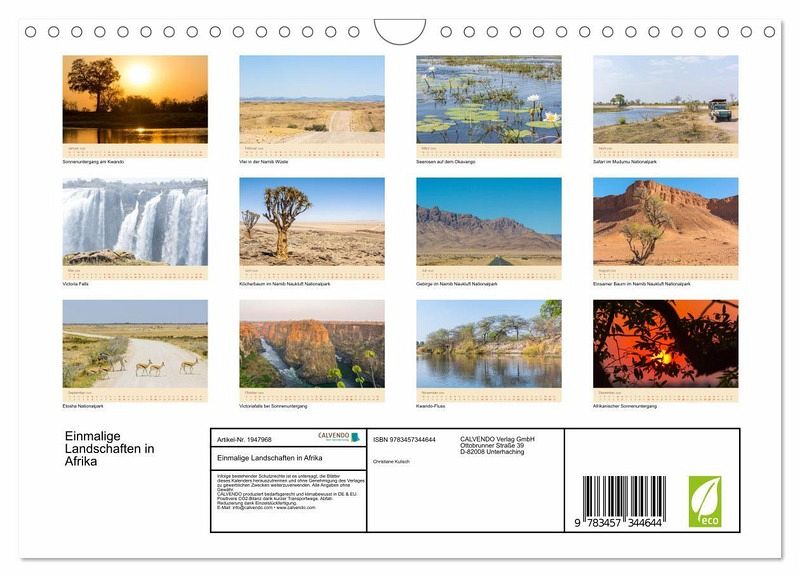 QUALITÄT - Hochwertiger Fotokalender mit 12 wunderschönen Motiven auf lichtbeständigem Bilderdruckpapier, robuste Spiralbindung mit Aufhängebügel.NACHHALTIG - deutliche Abfallreduzierung durch bedarfsgerechte Einzelstückfertigung, umweltfreundliches FSC-zertifiziertes Papier, Produktion in Deutschland, klimabewusste Logistik.PERFEKTES GESCHENK - Kalender für Freunde und Familie, für Kinder und Erwachsene, jung und alt, zu Weihnachten, Geburtstag oder zwischendurch.VIELFALT - Bildkalender in verschiedenen Formaten, z.B. DIN A5, DIN A4, DIN A3 sowie DIN A2. Ob Naturmotiv, Gemälde oder Fotos, ideal für ein persönliches Wohlfühlambiente.Afrika bietet faszinierende Landschaften von Autor(in): Christiane Kulisch