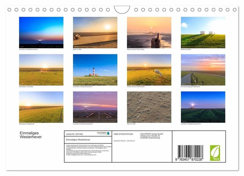 QUALITÄT - Hochwertiger Fotokalender mit 12 wunderschönen Motiven auf lichtbeständigem Bilderdruckpapier, robuste Spiralbindung mit Aufhängebügel.NACHHALTIG - deutliche Abfallreduzierung durch bedarfsgerechte Einzelstückfertigung, umweltfreundliches FSC-zertifiziertes Papier, Produktion in Deutschland, klimabewusste Logistik.PERFEKTES GESCHENK - Kalender für Freunde und Familie, für Kinder und Erwachsene, jung und alt, zu Weihnachten, Geburtstag oder zwischendurch.VIELFALT - Bildkalender in verschiedenen Formaten, z.B. DIN A5, DIN A4, DIN A3 sowie DIN A2. Ob Naturmotiv, Gemälde oder Fotos, ideal für ein persönliches Wohlfühlambiente.Hochwertige Fotografien aus Westerhever, St- Peter-Ording und Büsum von Autor(in): Alexander Steinhof