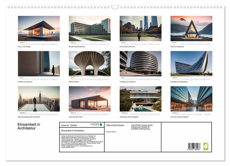 Tauchen Sie ein in die faszinierende Welt der Einsamkeit in der Architektur. Dieser einzigartige Kalender zeigt zwölf von KI generierte Bauwerke, die in ihrer stillen Pracht und Abgeschiedenheit beeindrucken. Ohne Ablenkung durch Menschen, konzentrieren sich die Bilder auf die majestätische Schönheit und ruhige Erhabenheit der Architektur. Jedes Kunstwerk ist ein Produkt fortschrittlicher Technologie und kreativer Vision, die Ihnen eine neue Perspektive auf Raum und Struktur bietet. Lassen Sie sich von der Klarheit und Reinheit dieser außergewöhnlichen Kreationen inspirieren. Perfekt für Liebhaber moderner Kunst und Architektur.