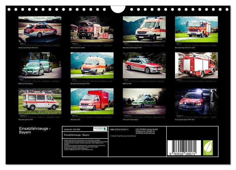 Kalender mit Einsatzfahrzeugen von Feuerwehr, Polizei und Rettungsdienst aus dem Süden Bayerns. Sehen Sie 12 Einsatzfahrzeuge im Einsatz für Ihre Sicherheit. Rettungswägen und Feuerwehrfahrzeuge bei der Einsatzfahrt oder an Einsatzstellen sowie Polizeifahrzeuge bei ihrer Tätigkeit. Staunen Sie was auf unseren Straßen für Ihre Sicherheit unterwegs ist.