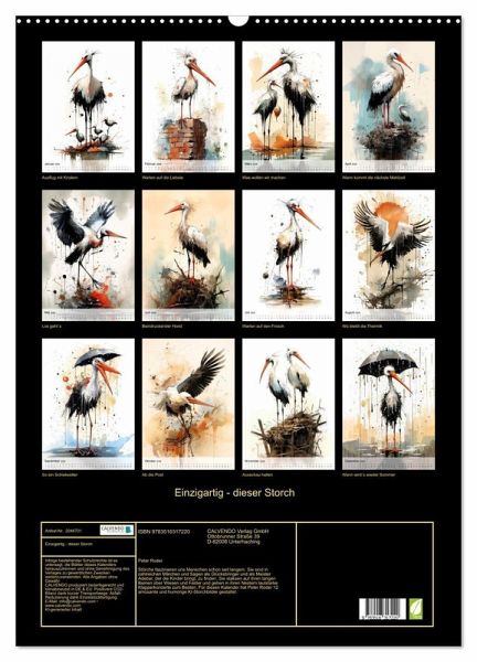 Störche faszinieren uns Menschen schon seit langem. Sie sind in zahlreichen Märchen und Sagen als Glücksbringer und als Meister Adebar, der die Kinder bringt, zu finden. Sie staksen auf ihren langen Beinen über Wiesen und Felder und geben in ihren Nestern lautstarke Klapperkonzerte zum Besten. Für diesen Kalender hat Peter Roder 12 amüsante und humorige KI-Strochbilder dargestellt