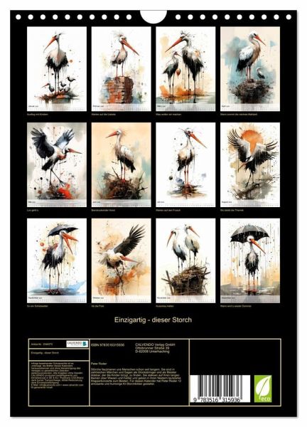 Störche faszinieren uns Menschen schon seit langem. Sie sind in zahlreichen Märchen und Sagen als Glücksbringer und als Meister Adebar, der die Kinder bringt, zu finden. Sie staksen auf ihren langen Beinen über Wiesen und Felder und geben in ihren Nestern lautstarke Klapperkonzerte zum Besten. Für diesen Kalender hat Peter Roder 12 amüsante und humorige KI-Strochbilder dargestellt