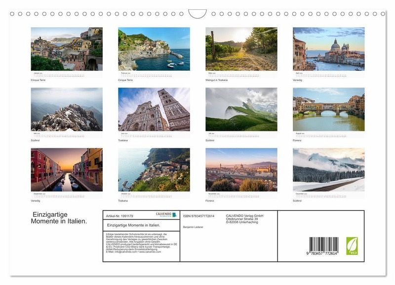 QUALITÄT - Hochwertiger Fotokalender mit 12 wunderschönen Motiven auf lichtbeständigem Bilderdruckpapier, robuste Spiralbindung mit Aufhängebügel.NACHHALTIG - deutliche Abfallreduzierung durch bedarfsgerechte Einzelstückfertigung, umweltfreundliches FSC-zertifiziertes Papier, Produktion in Deutschland, klimabewusste Logistik.PERFEKTES GESCHENK - Kalender für Freunde und Familie, für Kinder und Erwachsene, jung und alt, zu Weihnachten, Geburtstag oder zwischendurch.VIELFALT - Bildkalender in verschiedenen Formaten, z.B. DIN A5, DIN A4, DIN A3 sowie DIN A2. Ob Naturmotiv, Gemälde oder Fotos, ideal für ein persönliches Wohlfühlambiente.Kommen Sie mit auf eine Reise durch Italien. von Autor(in): Benjamin Lederer