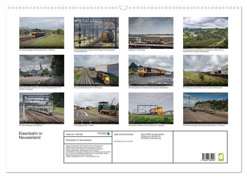 Neuseeland besticht neben seinem Landschaftsbild auch mit einer ungeheuren Vielfalt auf der Schiene. Dieser Kalender zeigt Eisenbahnmotive, welche auf der Nordinsel in Szene gesetzt wurden.