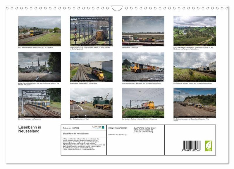 Neuseeland besticht neben seinem Landschaftsbild auch mit einer ungeheuren Vielfalt auf der Schiene. Dieser Kalender zeigt Eisenbahnmotive, welche auf der Nordinsel in Szene gesetzt wurden.