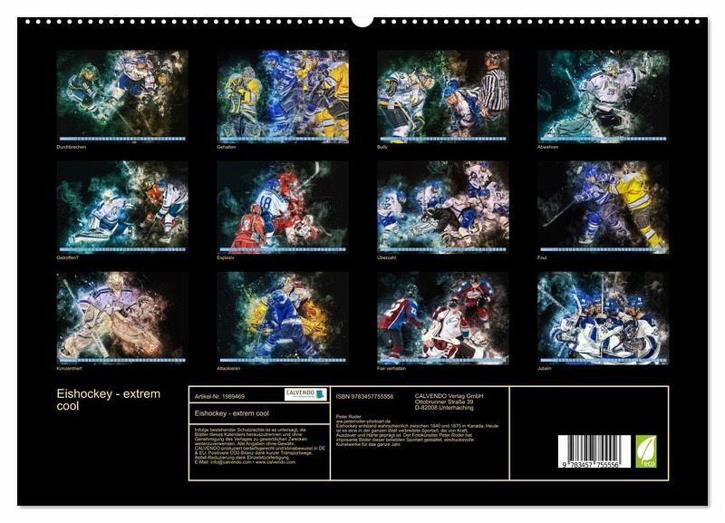 Eishockey entstand wahrscheinlich zwischen 1840 und 1875 in Kanada. Heute ist es eine in der ganzen Welt verbreitete Sportart, die von Kraft, Ausdauer und Härte geprägt ist. Der Fotokünstler Peter Roder hat imposante Bilder dieser beliebten Sportart gestaltet, eindrucksvolle Kunstwerke für das ganze Jahr.