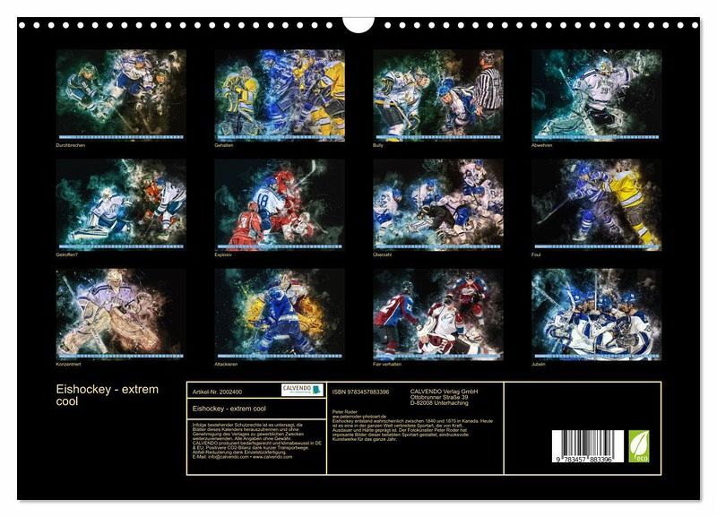 Eishockey entstand wahrscheinlich zwischen 1840 und 1875 in Kanada. Heute ist es eine in der ganzen Welt verbreitete Sportart, die von Kraft, Ausdauer und Härte geprägt ist. Der Fotokünstler Peter Roder hat imposante Bilder dieser beliebten Sportart gestaltet, eindrucksvolle Kunstwerke für das ganze Jahr.