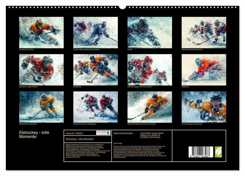 Tauchen Sie ein in die herzerfrischende Welt des Eishockeys. Erleben Sie die kühle Intensität des schnellsten Mannschaftssports, bei dem sich spannende Duelle auf dem Eis abspielen. Schlittschuhläuferische Geschicklichkeit und gefühlvolle Puck-Kontrolle gepaart mit harter Zweikampfführung und krachenden Bodychecks machen diesen Sport so faszinierend. Der Fotokünstler Peter Roder hat fantastische KI-Bilder gestaltet und zusammengestellt. Ein Muss für alle, die Spaß und Freude am Eishockey haben.
