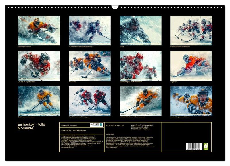 Tauchen Sie ein in die herzerfrischende Welt des Eishockeys. Erleben Sie die kühle Intensität des schnellsten Mannschaftssports, bei dem sich spannende Duelle auf dem Eis abspielen. Schlittschuhläuferische Geschicklichkeit und gefühlvolle Puck-Kontrolle gepaart mit harter Zweikampfführung und krachenden Bodychecks machen diesen Sport so faszinierend. Der Fotokünstler Peter Roder hat fantastische KI-Bilder gestaltet und zusammengestellt. Ein Muss für alle, die Spaß und Freude am Eishockey haben.