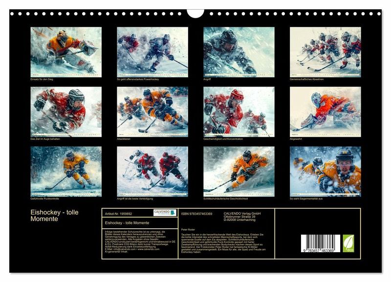 Tauchen Sie ein in die herzerfrischende Welt des Eishockeys. Erleben Sie die kühle Intensität des schnellsten Mannschaftssports, bei dem sich spannende Duelle auf dem Eis abspielen. Schlittschuhläuferische Geschicklichkeit und gefühlvolle Puck-Kontrolle gepaart mit harter Zweikampfführung und krachenden Bodychecks machen diesen Sport so faszinierend. Der Fotokünstler Peter Roder hat fantastische KI-Bilder gestaltet und zusammengestellt. Ein Muss für alle, die Spaß und Freude am Eishockey haben.