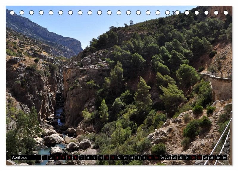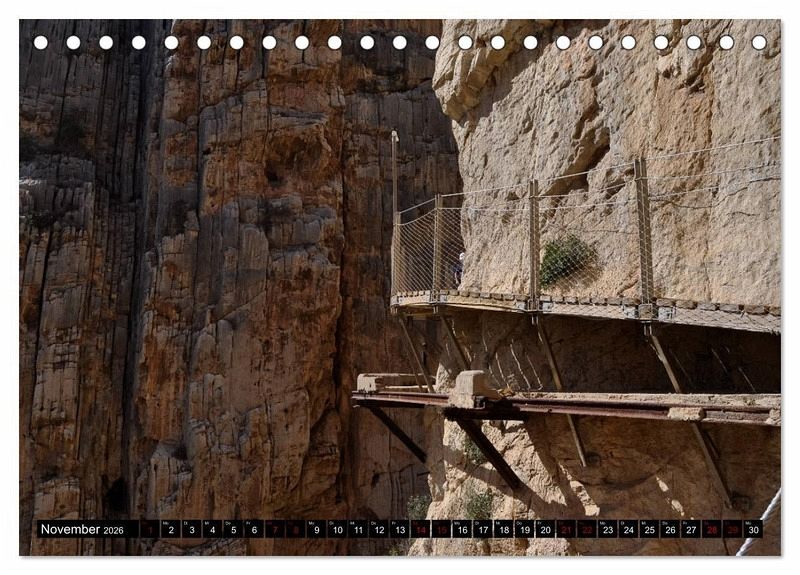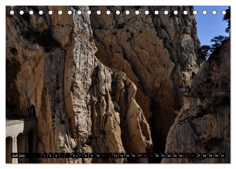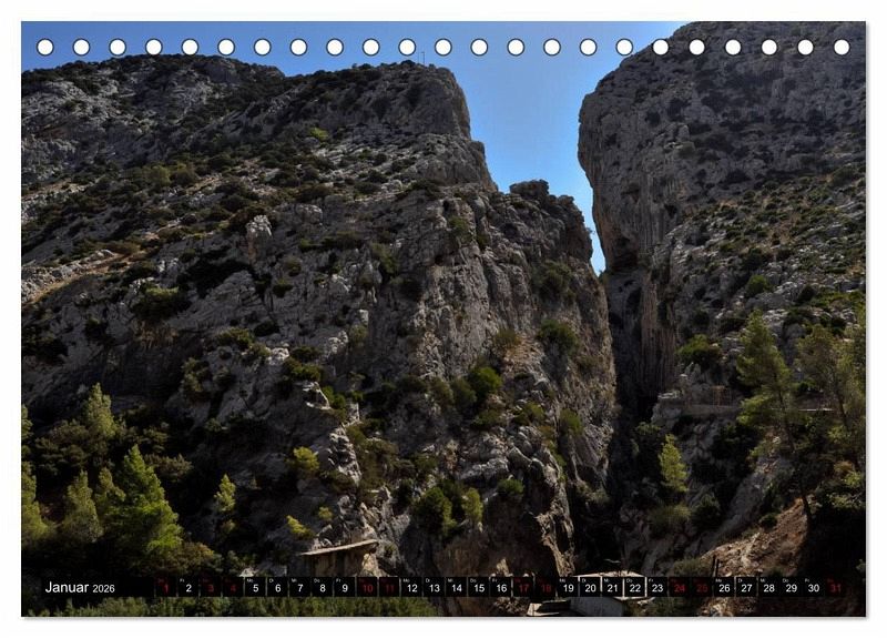 Bei den CALVENDO Editionen handelt es sich um eine streng limitierte Anzahl handverlesener Kalender, welche CALVENDO aufgrund ihrer Güte als außergewöhnlich wertvoll und typisch für ihr jeweiliges Sujet erachtet und dem Kalenderfreund daher besonders an Herz legen mochte.Der Caminito del Rey ist ein spektakulärer Wanderweg bei El Chorro in der Nähe von Málaga (Spanien). Ursprünglich als Versorgungsweg für die Stauseen errichtet, welche zur Wasserspeicherung und Stromerzeugung dienen, führt er durch mehrere bis zu 200 Meter tiefe Schluchten. Der Weg verdankt seinen Namen dem Besuch des Königs von Spanien bei der Fertigstellung im Jahre 1921. Im Verlauf der Jahrzehnte verfiel der Pfad und mutierte zum "gefährlichsten Klettersteg der Welt". Nach einer Sperrung aufgrund mehrerer Todesfälle wurde er schließlich von 2014 - 2015 für mehrere Millionen Euro aufwendig wieder hergestellt. Heraus gekommen ist ein beeindruckend aufregender Wanderweg der sich in teilweise 100 Metern Höhe an den senkrechten Felsen entlang schlängelt. Ein absolut lohnenswertes Ausflugsziel Andalusiens.